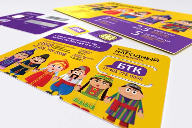 Для реализации наиболее экономного пакета мобильной связи компании «Бизнес Телеком» Желтой Собакой был разработан нейминг, фирменный стиль и оформлена сим-карта тарифа «Народный».