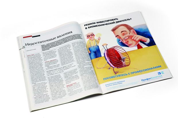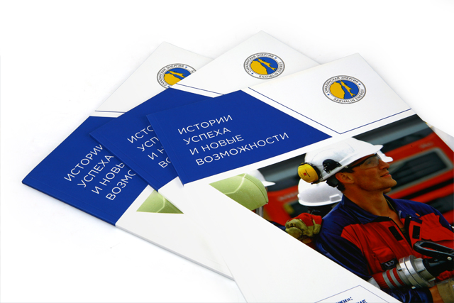 Разделы буклета начинаются с иллюстрированных шмуцтитулов: динамичная репортажная фотография, показывающая людей в рабочей обстановке