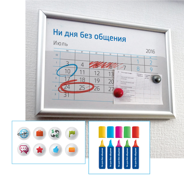 Этот календарь является и магнитной доской, и планировщиком, и доской для записей. Так же, для ряда особых случаев, в комплект входят специальные магниты с символами, которыми можно помечать важные события и крепить к доске записки и объявления.