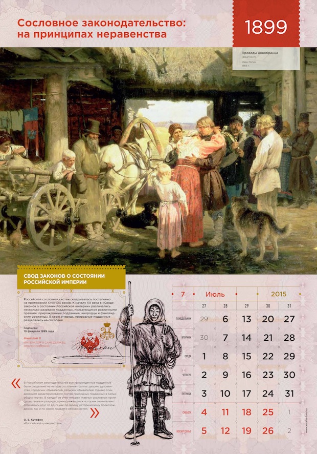 Поскольку речь идет не просто об истории, но об истории права, то каждая ключевая дата связана с конкретным законодательным актом. Мы превратили краткую историческую справку о законе в эффектный декоративный элемент, добавив изображение исторической гербовой печати и факсимиле подписи правителя. Ниже на листе располагается цитата из книги О.Е. Кутафина «Российское гражданство» – авторский взгляд на данное историческое событие. |