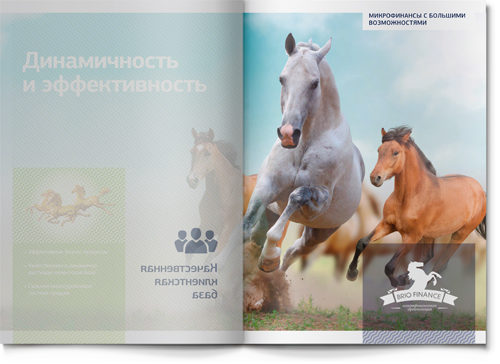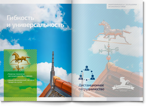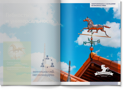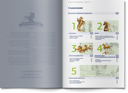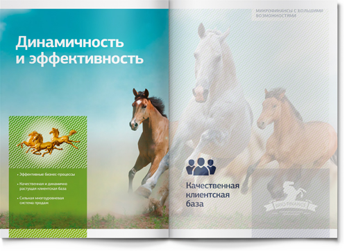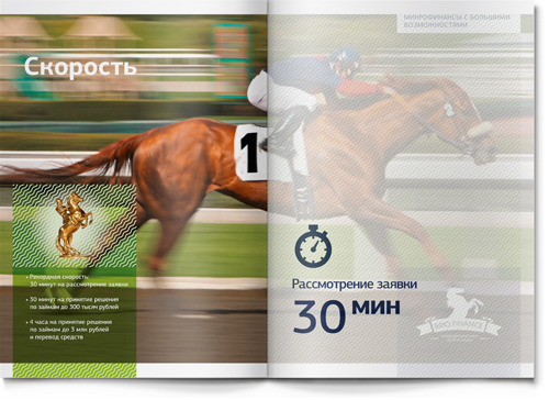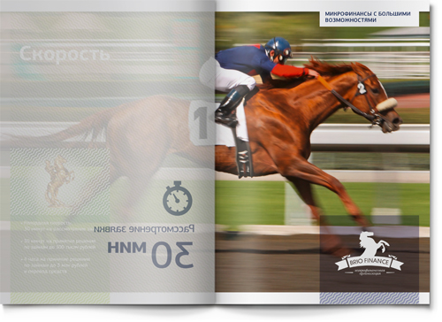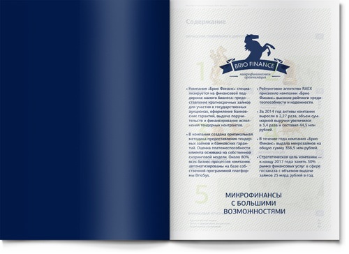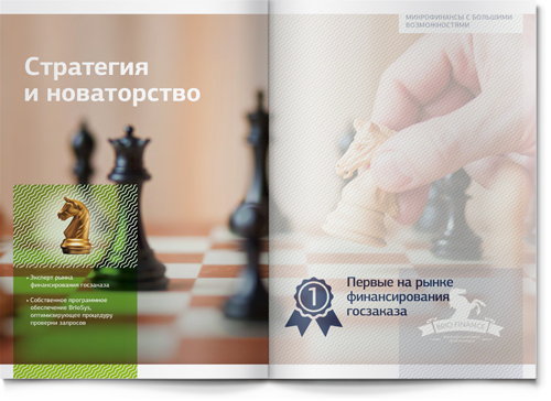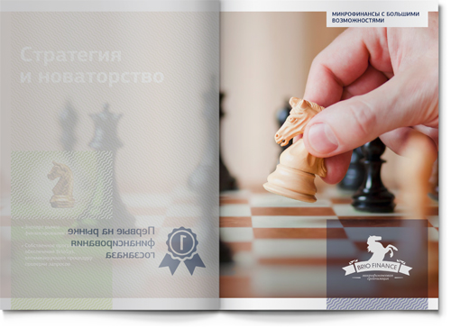 В работе над имиджевой частью буклета мы опирались на существующий фирменный знак компании BRIO FINANCE. Лошадь – прекрасный благородный символ, динамичный и запоминающийся. На входных разворотах основных разделов мы использовали этот образ для того, чтобы проиллюстрировать стиль бизнеса нашего клиента. Так, скаковая лошадь символизирует скорость (для компании, кредитующей участников тендеров на госзакупки, скорость рассмотрения заявки является ключевым фактором успеха). Шахматный конь – символ продуманной стратегии (у компании есть даже два детальных плана развития бизнеса – один для плохой рыночной ситуации, другой – для хорошей: наш клиент действительно умеет думать на несколько шагов вперед!).