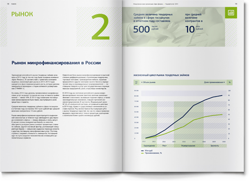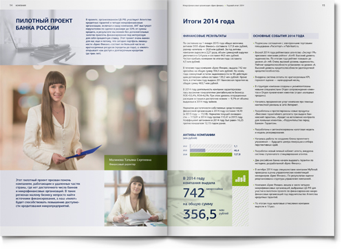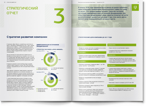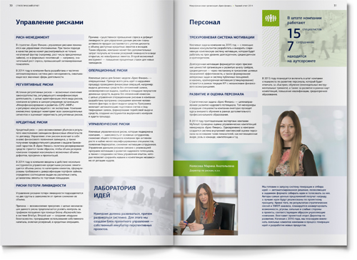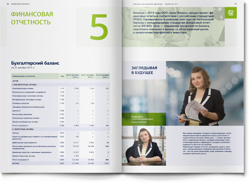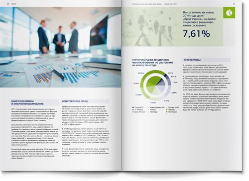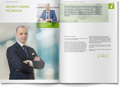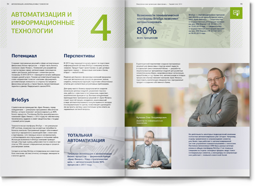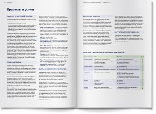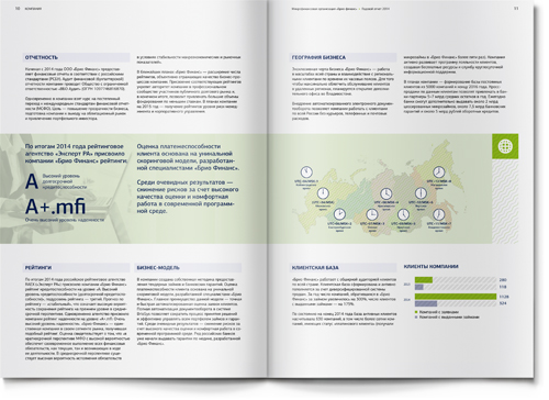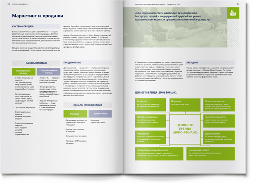 Для того чтобы адаптировать материал под привычные финансовой аудитории форматы, мы использовали традиционную структуру банковского годового отчета: последовательность разделов, инфографика, красочные развороты в начале новой темы. Как и положено годовому отчету, наш буклет включает обращение генерального директора, описание бизнес-модели, детальный анализ рыночной ситуации и, конечно, раздел финансовой отчетности.