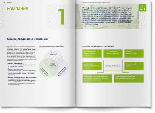 Российский рынок микрофинансирования все еще находится в стадии формирования, как и общий имидж этого бизнеса: для многих, образ микрофинансовых организаций все еще связан с представлениями о компаниях-однодневках, выдающих маленькие кредиты под баснословный процент. Потому в числе основных задач, поставленных перед нами клиентом, была работа с имиджем компании. Наш буклет должен был убедительно показать, что BRIO FINANCE – это серьезная компания с прозрачным бизнесом, продуманной стратегией и лояльной клиентской базой. |