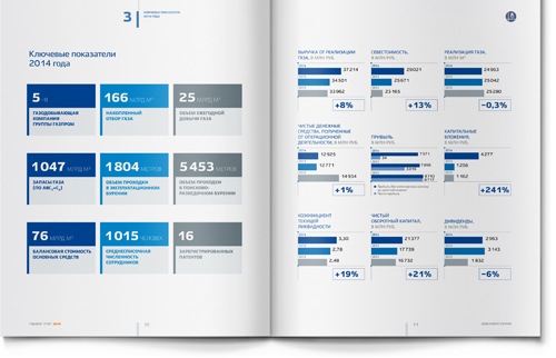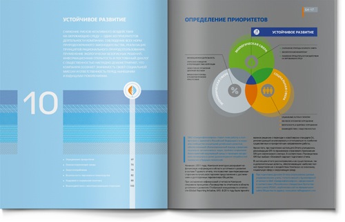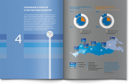 Важным элементом дизайна стали пласты (срезы) земли, показанные так, как их обозначают на геологических планах. Этот стилеобразующий элемент проходит через весь отчет: от титульного листа, через шмуцтитулы и иллюстративные развороты, до задней обложки.