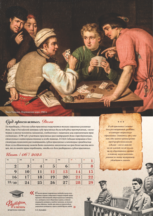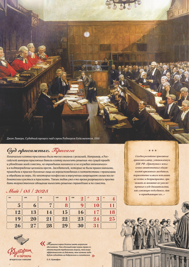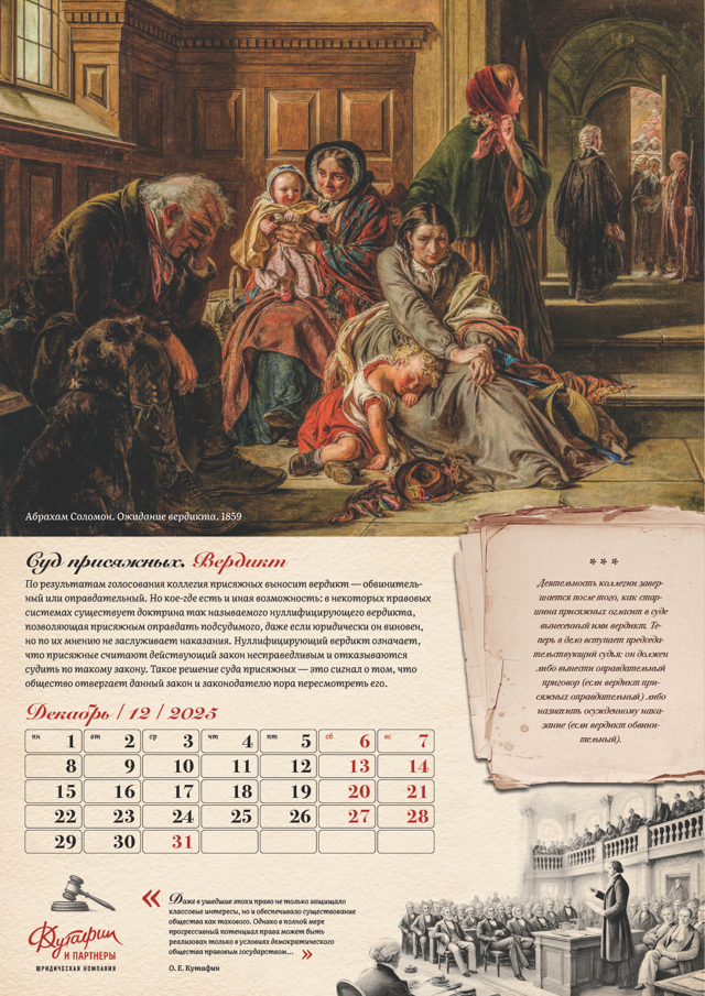 Календарь "Суд присяжных" от агентства "Желтая собака" для юридической компании "Кутафин и партнеры" – это уникальный проект, который сочетает глубокий исторический анализ, юридическую тематику и художественное оформление. Он подчеркивает значение суда присяжных как важнейшего инструмента правосудия и напоминает о его эволюции на протяжении веков. Проект является данью уважения правовой культуре и ценностям демократического общества.