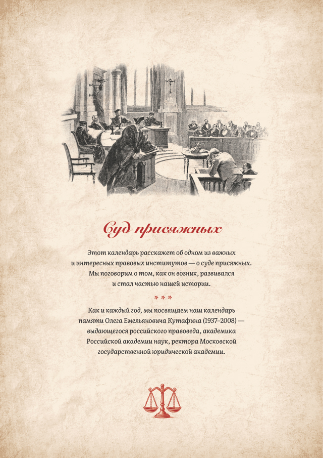 Календарь традиционно посвящен памяти выдающегося российского правоведа, академика РАН, ректора Московской государственной юридической академии Олега Емельяновича Кутафина (1937–2008). Его труды и идеи продолжают вдохновлять новые поколения юристов и граждан, верящих в силу закона и справедливость.