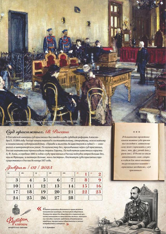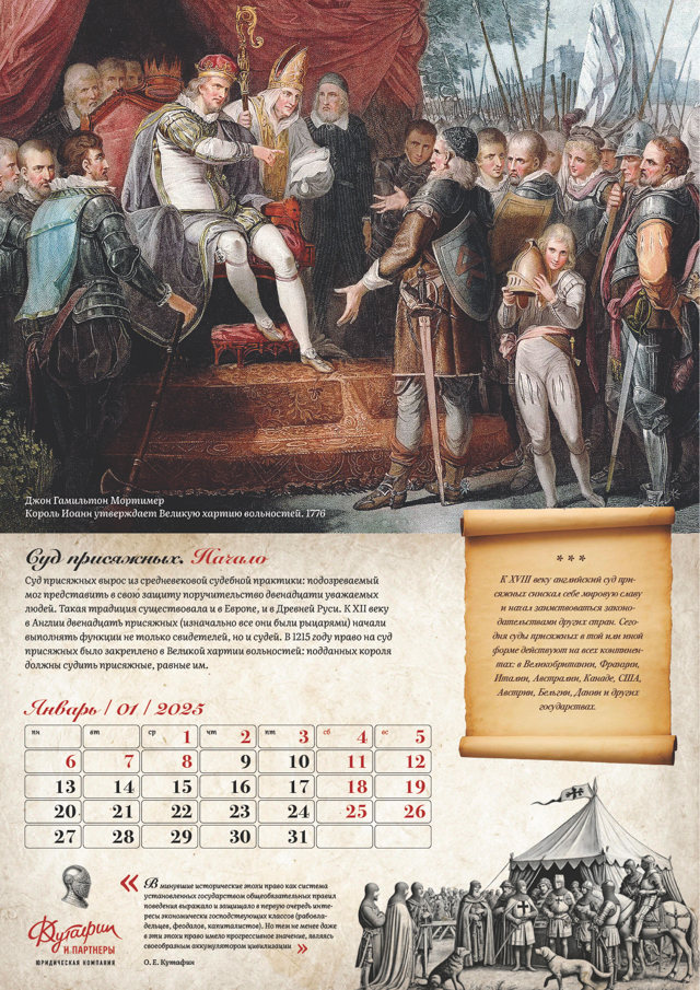 Январь – появление суда присяжных в Англии в XII веке. Визуальное оформление включает изображения рыцарей и знати в средневековых костюмах. Февраль – введение суда присяжных в России по реформе Александра II 1864 года. Иллюстрации передают дух того времени, включая сцену подписания указа императором.