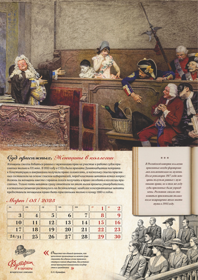 Март – вопрос участия женщин в коллегии присяжных. Вдохновением стали американские суды 1920-х годов, где впервые женщины заняли места присяжных. Апрель – состав присяжных в разных странах, от шотландской коллегии из 15 человек до современных судов с участием 6-12 заседателей. Май – традиции приведения присяжных к присяге в различных культурах, начиная от целования креста в Российской империи и заканчивая современными клятвами в США и Европе.