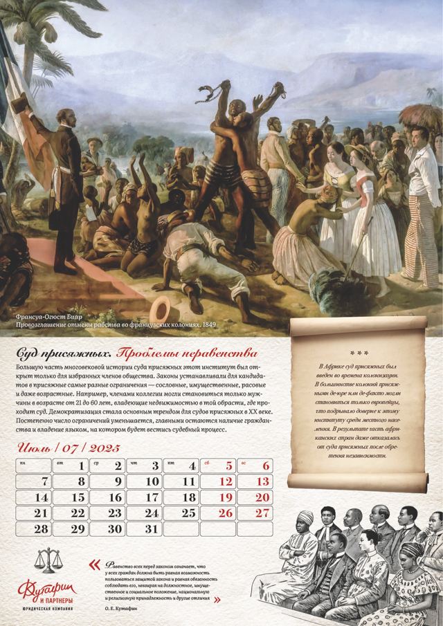Июнь – категории дел, рассматриваемых судом присяжных. Исторические сцены судебных процессов XIX века наглядно демонстрируют этот аспект. Июль – вопросы равенства и дискриминации при формировании коллегии присяжных. Внимание уделено практике африканских стран, бывших колоний Европы. Август – процесс отбора присяжных. Иллюстрации показывают взаимодействие адвокатов и кандидатов в коллегию.